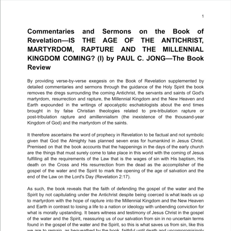 By providing verse-by-verse exegesis on the Book of Revelation supplemented by detailed commentaries and sermons through the guidance of the Holy Spirit the book removes the dregs surrounding the coming Antichrist, the servants and saints of God`s martyrdom, resurrection and rapture, the Millennial Kingdom and the New Heaven and Earth expounded in the writings of apocalyptic eschatologists about the end times brought in by false Christian theologies related to pre-tribulation rapture or post-tribulation rapture and amillennialism (the inexistence of the thousand-year Kingdom of God) and the martyrdom of the saints.