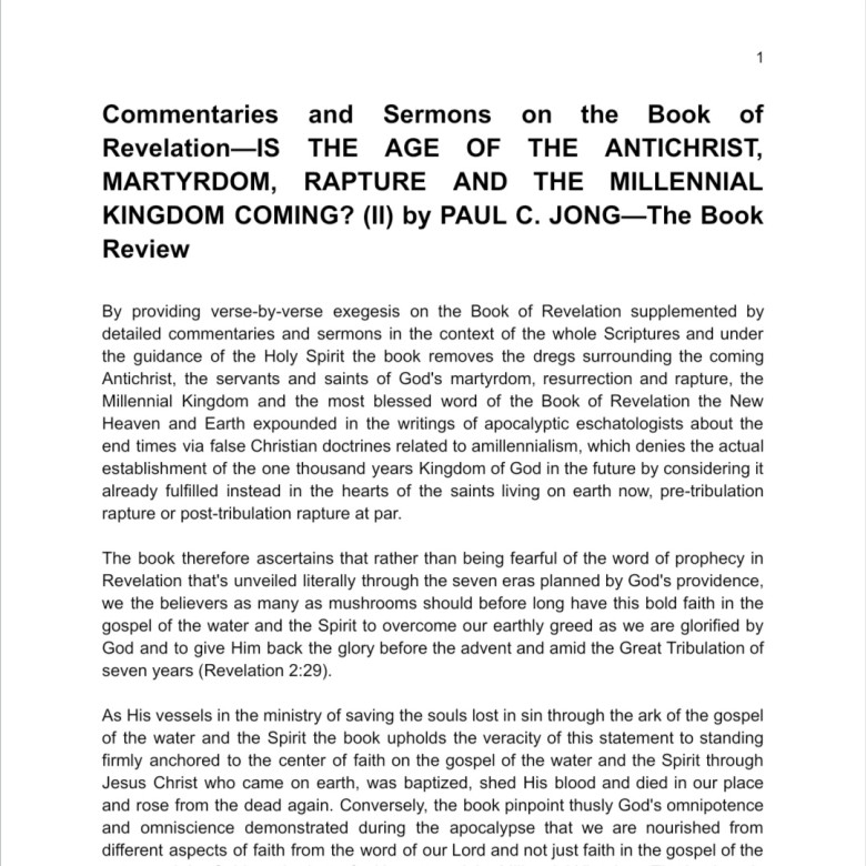 Commentaries and Sermons on the Book of Revelation—IS THE AGE OF THE ANTICHRIST, MARTYRDOM, RAPTURE AND THE MILLENNIAL KINGDOM COMING? (II)—The Book Review