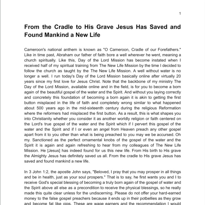 Cameroon`s national anthem is known as "O Cameroon, Cradle of our Forefathers." Like in time past, Abraham our father of faith bore a well wherever he went, meaning a church spiritually. Like this, Day of the Lord Mission has become instated when I received half of my spiritual training from The New Life Mission by the time I decided to follow the church as taught by the The New Life Mission. A well without water is no longer a well. I run today`s Day of the Lord Mission basically online after virtually 20 years since my first love for Jesus Christ. Note that the backbone of my ministry The Day of the Lord Mission, available online and in the field, is for you to become a born again of the beautiful gospel of the water and the Spirit. And without you laying correctly and concretely this foundation of becoming a born again it is akin to getting the first button misplaced in the life of faith and completely wrong similar to what happened about 500 years ago in the mid-sixteenth century during the religious Reformation where the reformers had misplaced the first button. As a result, this is what shapes you into Christianity whether you consider it as another worldly religion or faith centered on the Lord`s true gospel of the water and the Spirit which if I pervert this gospel of the water and the Spirit and if I or even an angel from Heaven preach any other gospel apart from it to you other than what is being preached to you may we be accursed. Oh my. Sanctioned as the perfect ornamental knobs of the gospel of the water and the Spirit it is again and again refreshing to hear from my colleagues of The New Life Mission. He [Jesus] has indeed found for us this new life. From His birth to His grave the Almighty Jesus has definitely saved us all. From the cradle to His grave Jesus has saved and found mankind a new life.