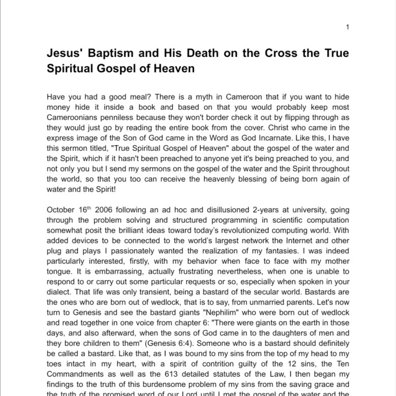 Have you had a good meal? There is a myth in Cameroon that if you want to hide money hide it inside a book and based on that you would probably keep most Cameroonians penniless because they won`t border check it out by flipping through as they would just go by reading the entire book from the cover. Christ who came in the express image of the Son of God came in the Word as God Incarnate. Like this, I have this sermon titled, "True Spiritual Gospel of Heaven" about the gospel of the water and the Spirit, which if it hasn`t been preached to anyone yet it`s being preached to you, and not only you but I send my sermons on the gospel of the water and the Spirit throughout the world, so that you too can receive the heavenly blessing of being born again of water and the Spirit!