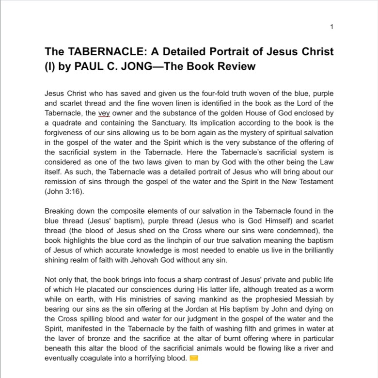 Not only that, the book brings into focus a sharp contrast of Jesus` private and public life of which He placated our consciences during His latter life, although treated as a worm while on earth, with His ministries of saving mankind as the prophesied Messiah by bearing our sins as the sin offering at the Jordan at His baptism by John and dying on the Cross spilling blood and water for our judgment in the gospel of the water and the Spirit, manifested in the Tabernacle by the faith of washing filth and grimes in water at the laver of bronze and the sacrifice at the altar of burnt offering where in particular beneath this altar the blood of the sacrificial animals would be flowing like a river and eventually coagulate into a horrifying blood. ✉️